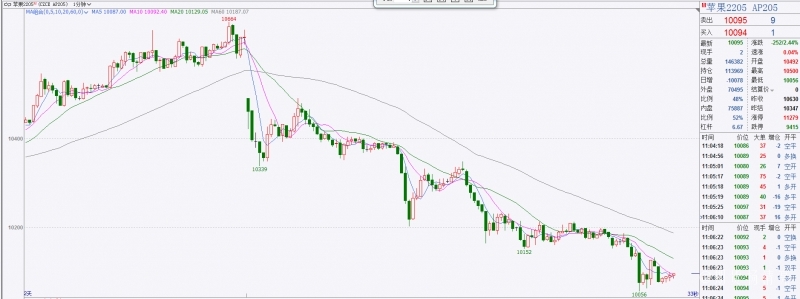 苹果05合约,今天从开盘跳空低开以后,继续低走,截止中午,已经从最高点10664跌了600多点。主要是受山东和陕西疫情情绪影响,多头信心不足,主动减仓撤离,导致盘面下跌。05合约持仓逐渐减少,投机资金偏向落袋为安,到了下个月,是否会发生逼仓行情,最后还不能能涨,拭目以待。个人看法,趋势未改,低位企稳再接多,不能盲目接飞刀,谨慎参与。