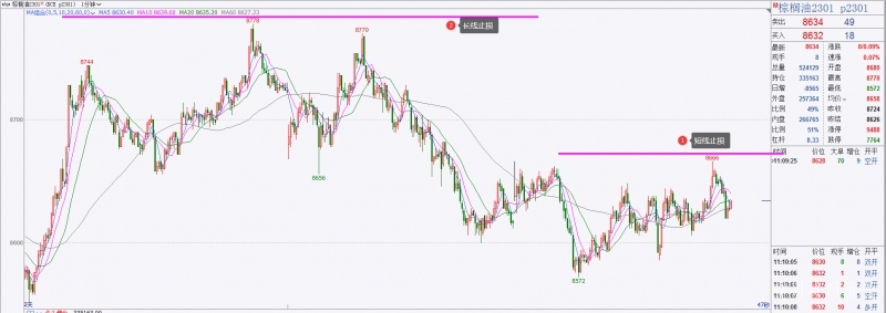 举个例子,棕榈油做空,短线和长线止损是不同的,但是盈亏比最好都保持3:1以上,不到止损和止盈位置,可以不离场。短线止损30 个点,止盈100个点,长线止损120个点,止盈400个点。分批入场,分批止损,增加胜率,长期坚持,盈利会大于亏损。严格执行。可能有