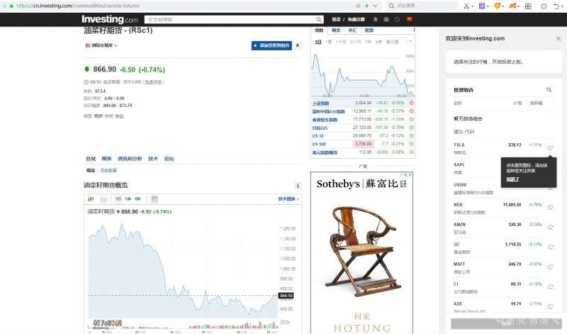 三大油脂都是有外盘的,豆油的外盘主要参考美豆和美豆油,棕榈油主要是马棕油,菜油主要是加菜油。豆油和棕榈油的实时行情在新浪外盘里有显示,但是加菜油没有,甚至在大部分交易软件上也找不到,比如文华财经里也没有。以前在TradingView是可以看到外盘行情的,但是因为这些网站有加密货币交易,基本都被强了,看不到。香港的网站是可以查的,但是也被强了。investing.com这个网站还可以看,但是不要启用网站过滤,比如360浏览器直接不让打开最好用edge或者chrome来查看,经过测试,是可以看到加菜油的实时行情的,希望对做油脂的朋友有帮助。