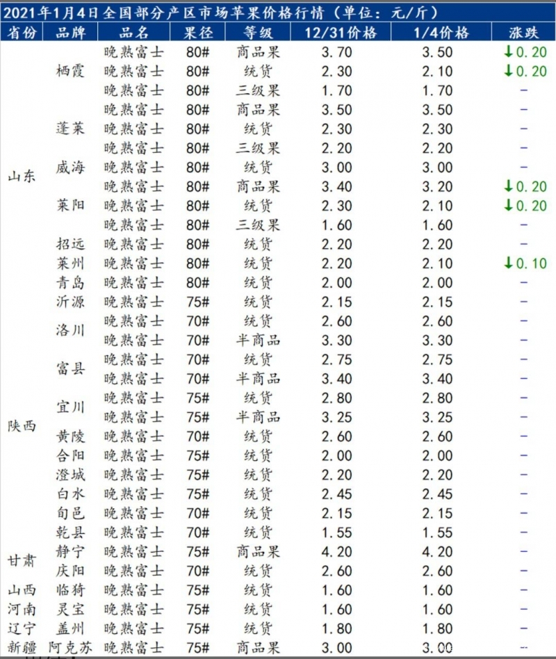 1月4日消息,山东烟台栖霞观里产区出库价格下滑0.1-0.2元/斤。80#以上一二级半片红价格3.3元/斤左右,80#统货出库价格1.9-2.3元/斤,75#-80#三级1.5-1.7元/斤。